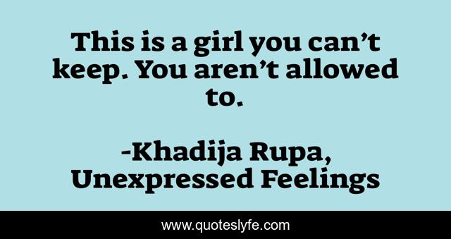 This page presents the quote "This is a girl you can’t keep. You aren’t allowed to.". Author of this quote is Khadija Rupa, Unexpressed Feelings. This quote is about khadija-rupa, unexpressed-feelings, keep, strength, she, impossible, girl, not-allowed,.