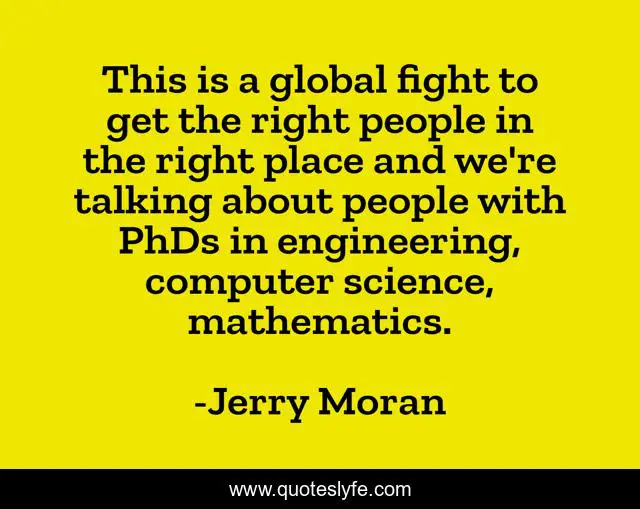 This page presents the quote "This is a global fight to get the right people in the right place and we're talking about people with PhDs in engineering, computer science, mathematics.". Author of this quote is Jerry Moran. This quote is about mathematics, fight,.