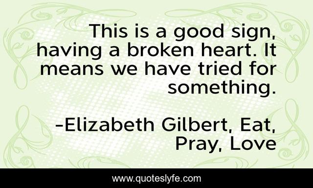 This page presents the quote "This is a good sign, having a broken heart. It means we have tried for something.". Author of this quote is Elizabeth Gilbert, Eat, Pray, Love. This quote is about heartache, love, affection,.