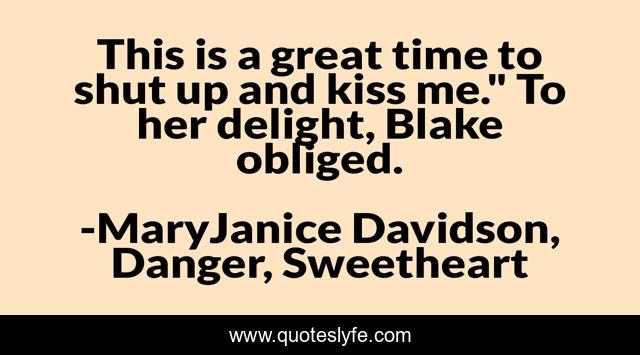 This page presents the quote "This is a great time to shut up and kiss me." To her delight, Blake obliged.". Author of this quote is MaryJanice Davidson, Danger, Sweetheart. This quote is about romance, contemporary, contemporary-romance,.