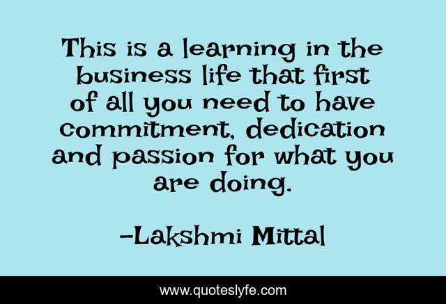 This page presents the quote "This is a learning in the business life that first of all you need to have commitment, dedication and passion for what you are doing.". Author of this quote is Lakshmi Mittal. This quote is about life, passion, learning,.