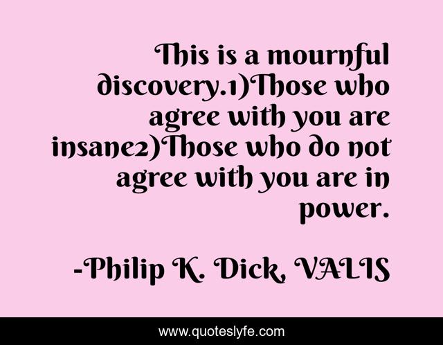 This page presents the quote "This is a mournful discovery.1)Those who agree with you are insane2)Those who do not agree with you are in power.". Author of this quote is Philip K. Dick, VALIS. This quote is about humor, paranoia,.