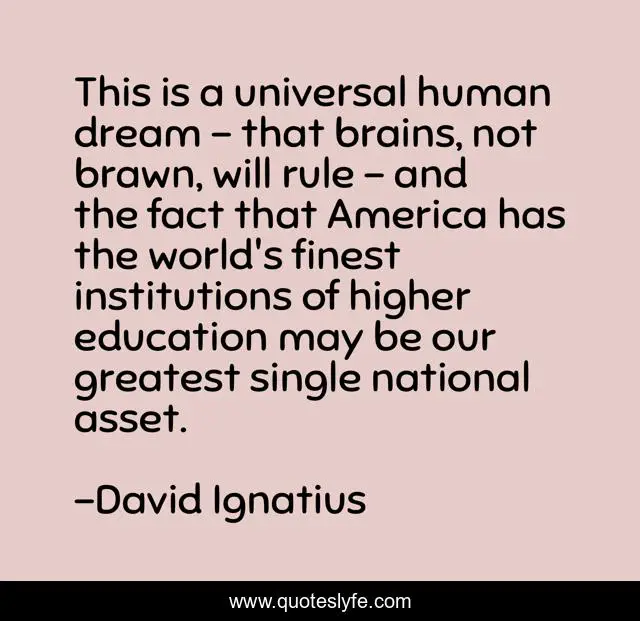 This page presents the quote "This is a universal human dream - that brains, not brawn, will rule - and the fact that America has the world's finest institutions of higher education may be our greatest single national asset.". Author of this quote is David Ignatius. This quote is about world, america, greatest,.