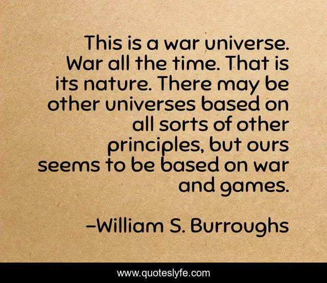 This page presents the quote "This is a war universe. War all the time. That is its nature. There may be other universes based on all sorts of other principles, but ours seems to be based on war and games.". Author of this quote is William S. Burroughs. This quote is about universe, nature, time,.
