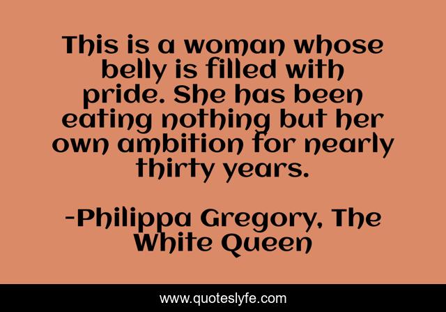 This page presents the quote "This is a woman whose belly is filled with pride. She has been eating nothing but her own ambition for nearly thirty years.". Author of this quote is Philippa Gregory, The White Queen. This quote is about ambition, cousins-war, the-white-queen,.