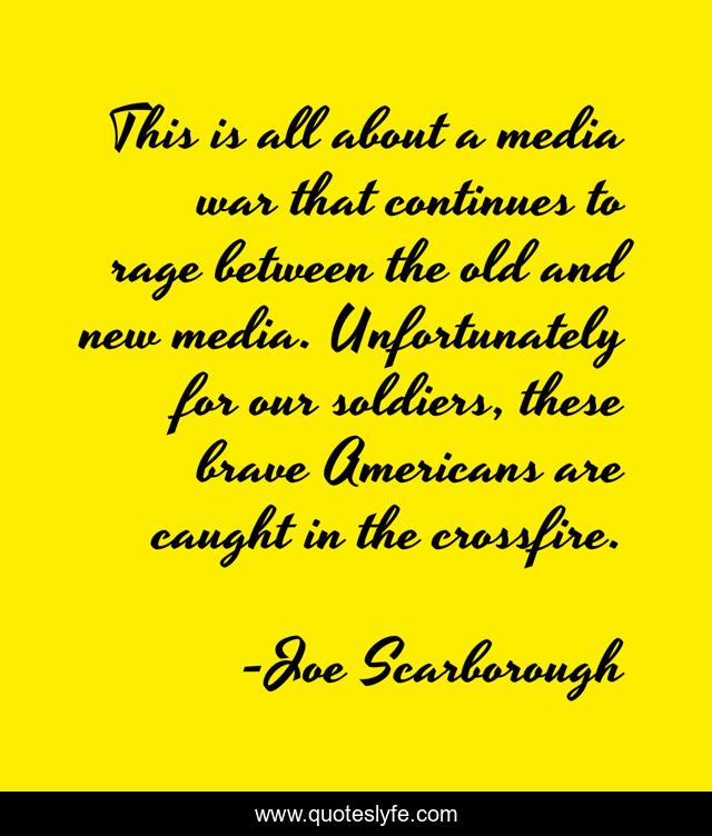 This page presents the quote "This is all about a media war that continues to rage between the old and new media. Unfortunately for our soldiers, these brave Americans are caught in the crossfire.". Author of this quote is Joe Scarborough. This quote is about media, brave, soldiers,.