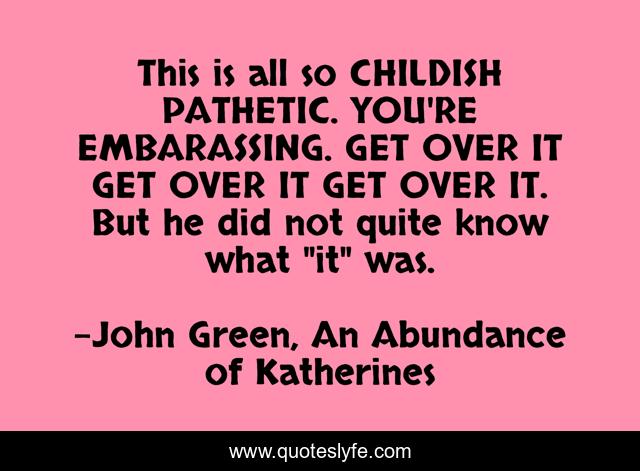This page presents the quote "This is all so CHILDISH PATHETIC. YOU'RE EMBARASSING. GET OVER IT GET OVER IT GET OVER IT. But he did not quite know what "it" was.". Author of this quote is John Green, An Abundance of Katherines. This quote is about behaviour, attitude,.