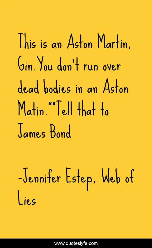 This page presents the quote "This is an Aston Martin, Gin.You don't run over dead bodies in an Aston Matin.""Tell that to James Bond". Author of this quote is Jennifer Estep, Web of Lies. This quote is about funny, comedy, james-bond, aston-martin, comeback, web-of-lies,.