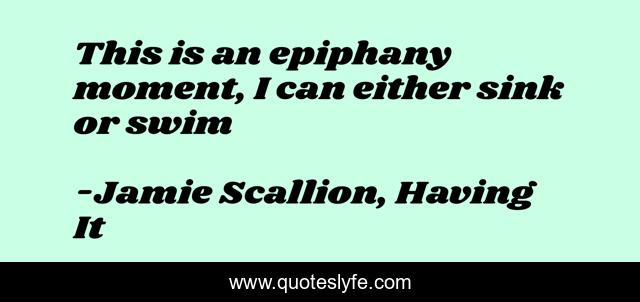 This page presents the quote "This is an epiphany moment, I can either sink or swim". Author of this quote is Jamie Scallion, Having It. This quote is about enthusiasm, young-adult-fiction, young-adult, inspirational, inspiration,.