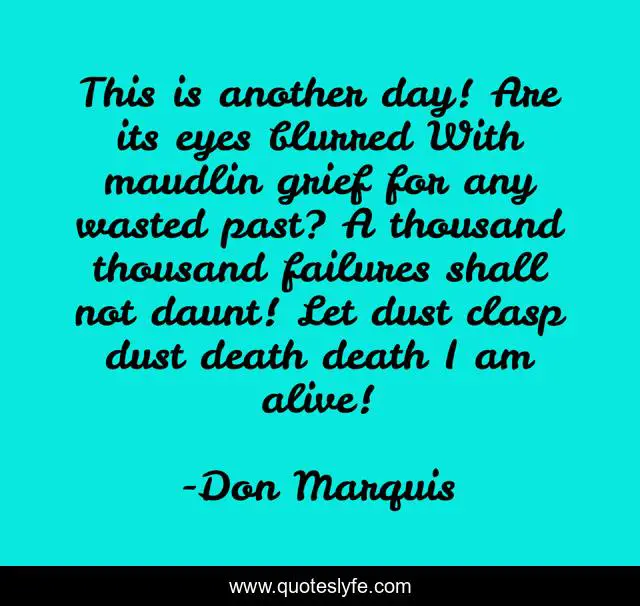 This page presents the quote "This is another day! Are its eyes blurred With maudlin grief for any wasted past? A thousand thousand failures shall not daunt! Let dust clasp dust death death I am alive!". Author of this quote is Don Marquis. .