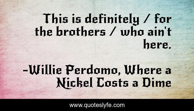 "Willie Perdomo, Where a Nickel Costs a Dime Quotes." Quoteslyfe.com, 2025. Mon. 08 Dec. 2025. <https://www.quoteslyfe.com/quote/This-is-definitely-for-the-brothers-who-25159>.