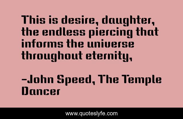 This page presents the quote "This is desire, daughter, the endless piercing that informs the universe throughout eternity, ". Author of this quote is John Speed, The Temple Dancer. This quote is about desire, eternity, universe,.