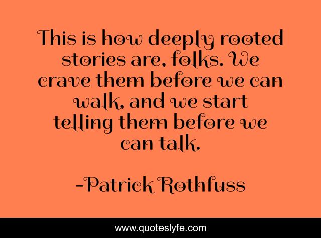 This page presents the quote "This is how deeply rooted stories are, folks. We crave them before we can walk, and we start telling them before we can talk.". Author of this quote is Patrick Rothfuss. .