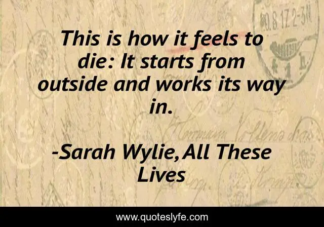 This page presents the quote "This is how it feels to die: It starts from outside and works its way in.". Author of this quote is Sarah Wylie, All These Lives. This quote is about dying, first-sentence,.