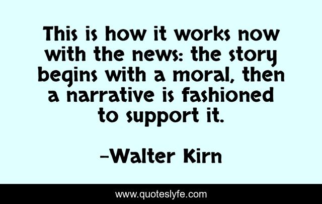 This page presents the quote "This is how it works now with the news: the story begins with a moral, then a narrative is fashioned to support it.". Author of this quote is Walter Kirn. This quote is about 2011-tuscon-shooting, twitter, media, 2011, news,.