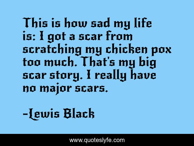 This page presents the quote "This is how sad my life is: I got a scar from scratching my chicken pox too much. That's my big scar story. I really have no major scars.". Author of this quote is Lewis Black. This quote is about life, my life, chicken,.
