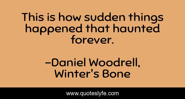 This page presents the quote "This is how sudden things happened that haunted forever.". Author of this quote is Daniel Woodrell, Winter's Bone. This quote is about sadness, decisions,.