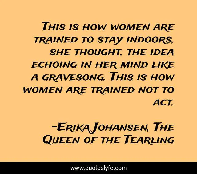 This page presents the quote "This is how women are trained to stay indoors, she thought, the idea echoing in her mind like a gravesong. This is how women are trained not to act.". Author of this quote is Erika Johansen, The Queen of the Tearling. This quote is about feminism, women,.