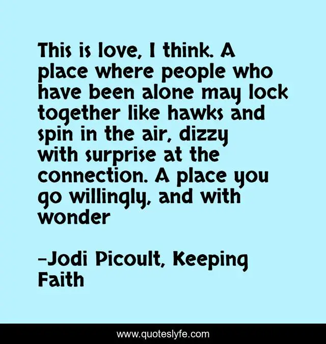 This page presents the quote "This is love, I think. A place where people who have been alone may lock together like hawks and spin in the air, dizzy with surprise at the connection. A place you go willingly, and with wonder". Author of this quote is Jodi Picoult, Keeping Faith. This quote is about romance, life, love, affection,.