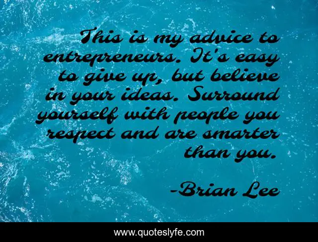 This page presents the quote "This is my advice to entrepreneurs. It's easy to give up, but believe in your ideas. Surround yourself with people you respect and are smarter than you.". Author of this quote is Brian Lee. This quote is about believe, yourself,.
