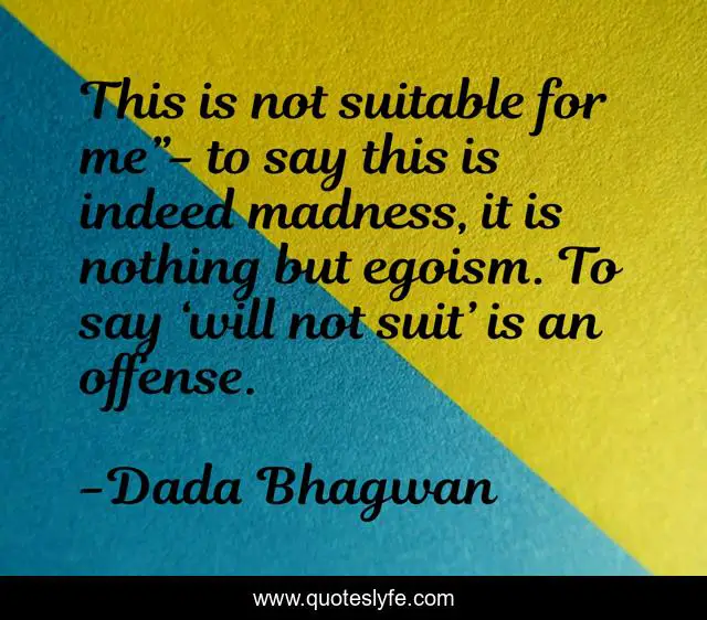 This page presents the quote "This is not suitable for me”- to say this is indeed madness, it is nothing but egoism. To say ‘will not suit’ is an offense.". Author of this quote is Dada Bhagwan. This quote is about offense, spiritual, suitable, ego, egoism,.