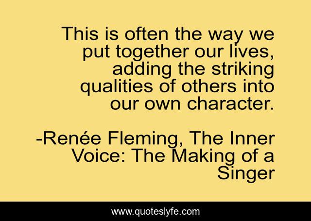 This page presents the quote "This is often the way we put together our lives, adding the striking qualities of others into our own character.". Author of this quote is Renée Fleming, The Inner Voice: The Making of a Singer. This quote is about character, lives, put-together, qualities, striking,.
