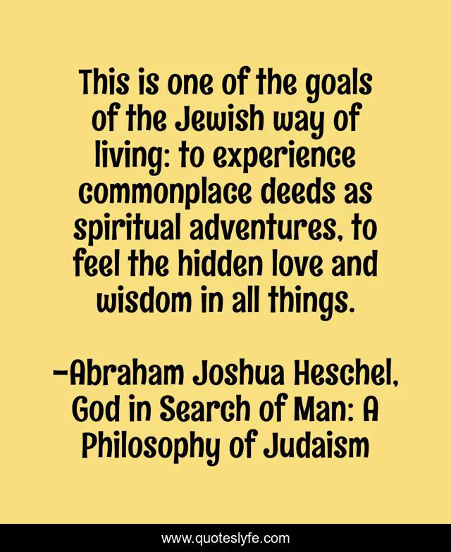 This page presents the quote "This is one of the goals of the Jewish way of living: to experience commonplace deeds as spiritual adventures, to feel the hidden love and wisdom in all things.". Author of this quote is Abraham Joshua Heschel, God in Search of Man: A Philosophy of Judaism. This quote is about love, adventure, affection, wisdom,.