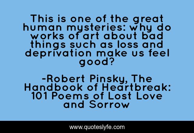 This page presents the quote "This is one of the great human mysteries: why do works of art about bad things such as loss and deprivation make us feel good?". Author of this quote is Robert Pinsky, The Handbook of Heartbreak: 101 Poems of Lost Love and Sorrow. This quote is about loss, deprivation, heartbreak,.