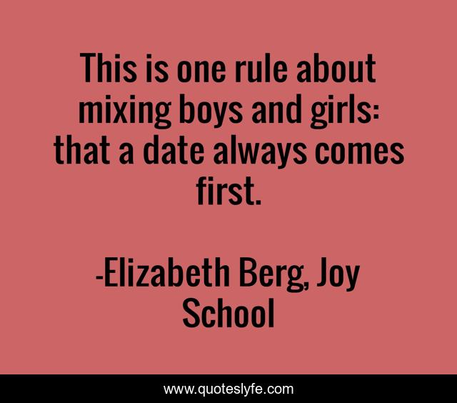 This page presents the quote "This is one rule about mixing boys and girls: that a date always comes first.". Author of this quote is Elizabeth Berg, Joy School. This quote is about teen, elizabeth-berg, datenight, rules, girls, joy-school, couples, boys, date,.