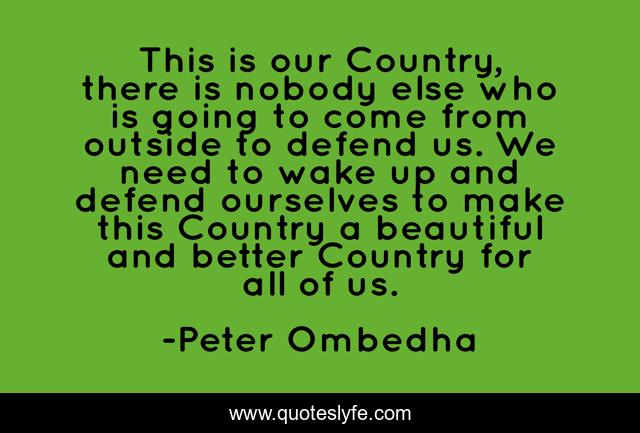 This page presents the quote "This is our Country, there is nobody else who is going to come from outside to defend us. We need to wake up and defend ourselves to make this Country a beautiful and better Country for all of us.". Author of this quote is Peter Ombedha. This quote is about country, freedom, humanity-and-society, inspirational, enthusiasm,.