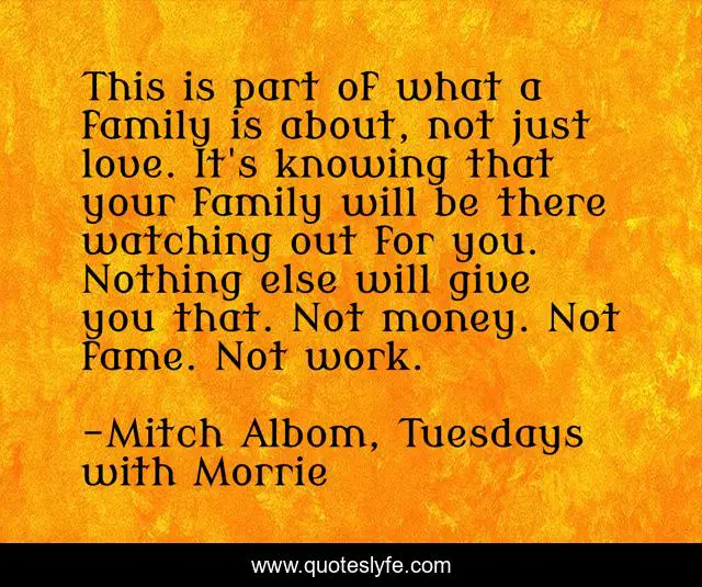 This page presents the quote "This is part of what a family is about, not just love. It's knowing that your family will be there watching out for you. Nothing else will give you that. Not money. Not fame. Not work.". Author of this quote is Mitch Albom, Tuesdays with Morrie. This quote is about love, family, affection,.