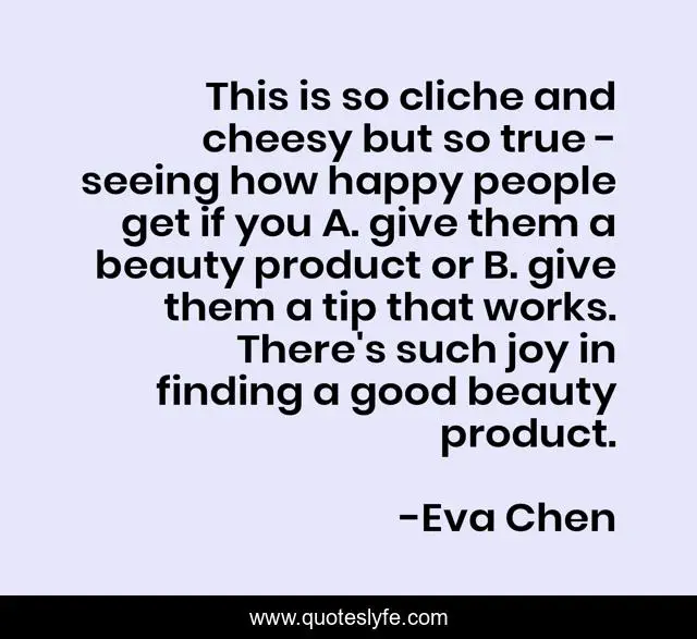 This page presents the quote "This is so cliche and cheesy but so true - seeing how happy people get if you A. give them a beauty product or B. give them a tip that works. There's such joy in finding a good beauty product.". Author of this quote is Eva Chen. This quote is about joy, good, happy,.