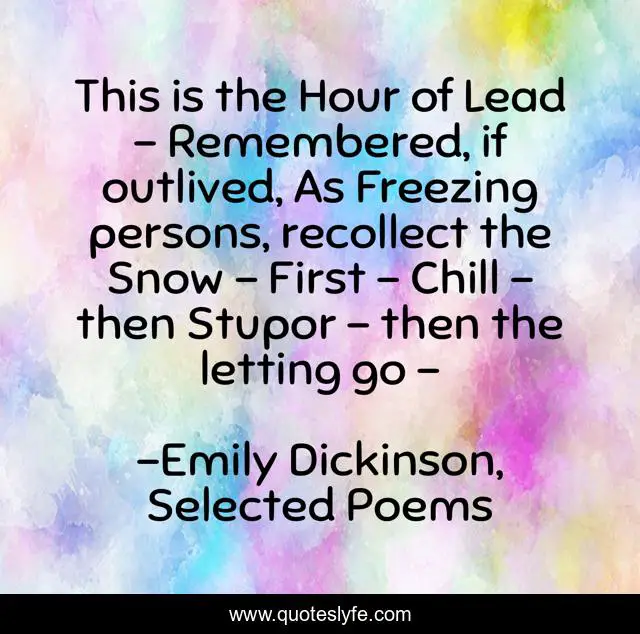 This page presents the quote "This is the Hour of Lead – Remembered, if outlived, As Freezing persons, recollect the Snow – First – Chill – then Stupor – then the letting go –". Author of this quote is Emily Dickinson, Selected Poems. .