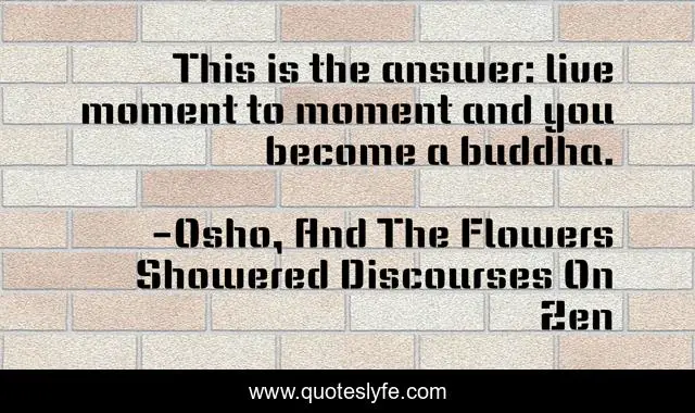 This page presents the quote "This is the answer: live moment to moment and you become a buddha.". Author of this quote is Osho, And The Flowers Showered Discourses On Zen. This quote is about moment, buddha,.