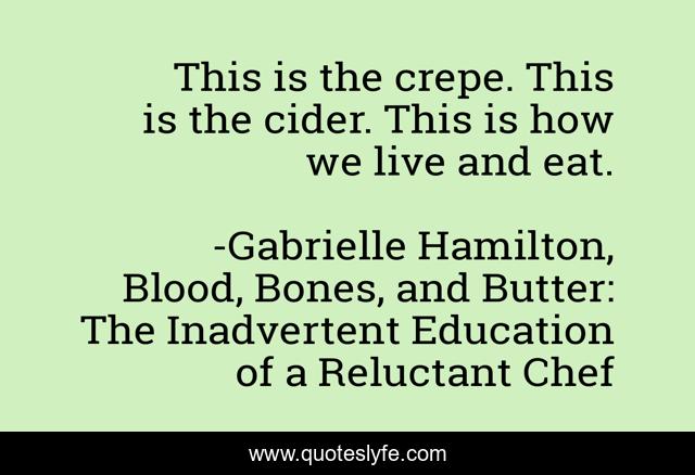 This page presents the quote "This is the crepe. This is the cider. This is how we live and eat.". Author of this quote is Gabrielle Hamilton, Blood, Bones, and Butter: The Inadvertent Education of a Reluctant Chef. .