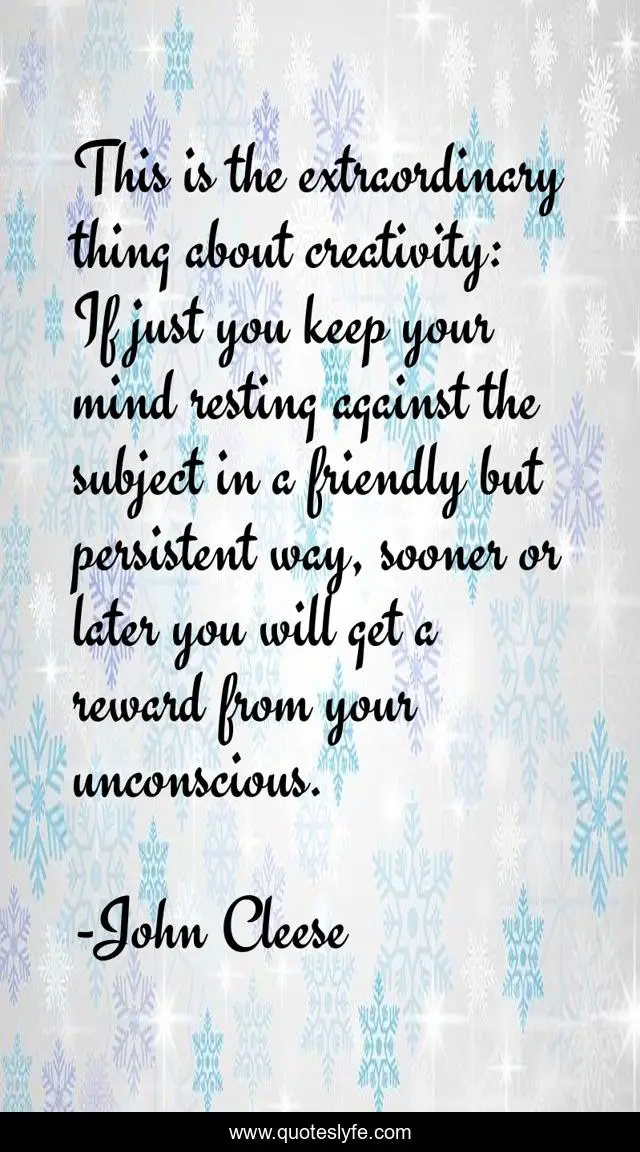 This page presents the quote "This is the extraordinary thing about creativity: If just you keep your mind resting against the subject in a friendly but persistent way, sooner or later you will get a reward from your unconscious.". Author of this quote is John Cleese. This quote is about creativity, inspiration,.