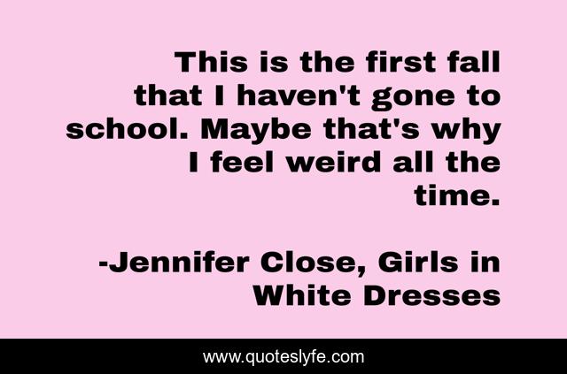 This page presents the quote "This is the first fall that I haven't gone to school. Maybe that's why I feel weird all the time.". Author of this quote is Jennifer Close, Girls in White Dresses. This quote is about life, growing-up,.