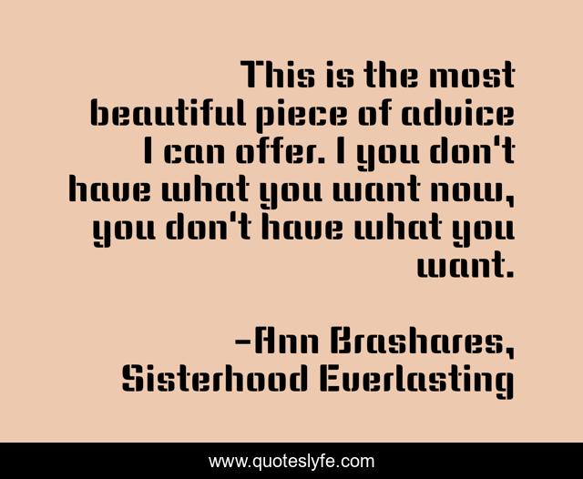This page presents the quote "This is the most beautiful piece of advice I can offer. I you don't have what you want now, you don't have what you want.". Author of this quote is Ann Brashares, Sisterhood Everlasting. This quote is about beautiful, advice, offer,.