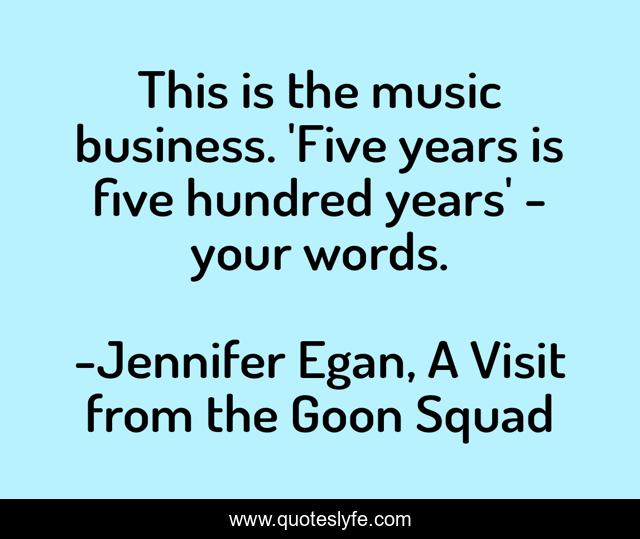 This page presents the quote "This is the music business. 'Five years is five hundred years' - your words.". Author of this quote is Jennifer Egan, A Visit from the Goon Squad. This quote is about music, business, reality,.