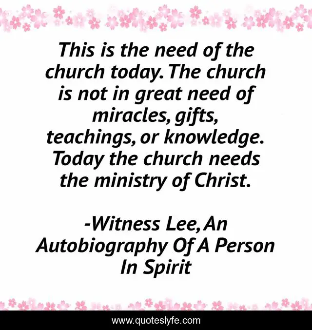 This page presents the quote "This is the need of the church today. The church is not in great need of miracles, gifts, teachings, or knowledge. Today the church needs the ministry of Christ.". Author of this quote is Witness Lee, An Autobiography Of A Person In Spirit. This quote is about the-church, christian-life, witness-lee, christ, ministry,.