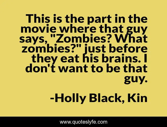 This page presents the quote "This is the part in the movie where that guy says, "Zombies? What zombies?" just before they eat his brains. I don't want to be that guy.". Author of this quote is Holly Black, Kin. This quote is about brains, zombies, movie-reference,.