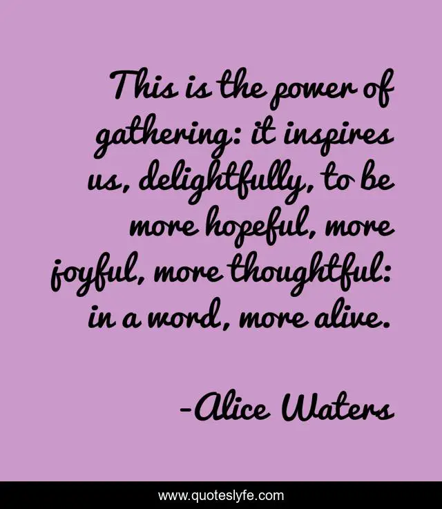 This page presents the quote "This is the power of gathering: it inspires us, delightfully, to be more hopeful, more joyful, more thoughtful: in a word, more alive.". Author of this quote is Alice Waters. This quote is about thoughtful, hopeful,.