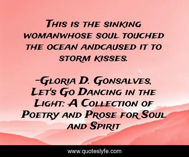 This page presents the quote "This is the sinking womanwhose soul touched the ocean andcaused it to storm kisses.". Author of this quote is Gloria D. Gonsalves, Let's Go Dancing in the Light: A Collection of Poetry and Prose for Soul and Spirit. This quote is about faith, spirituality, inspirational, enthusiasm, enlightenment, awareness,.
