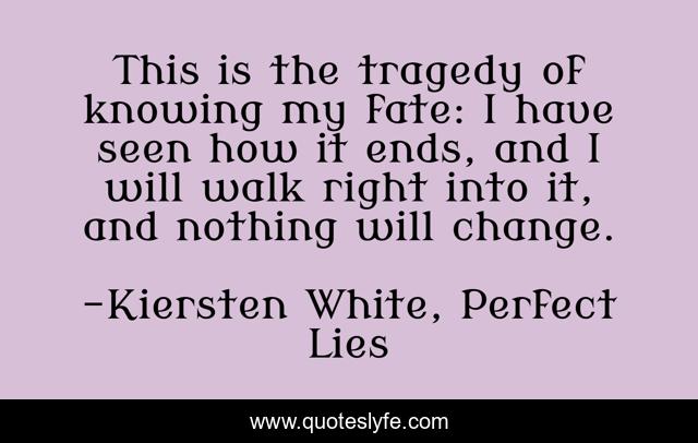 This page presents the quote "This is the tragedy of knowing my fate: I have seen how it ends, and I will walk right into it, and nothing will change.". Author of this quote is Kiersten White, Perfect Lies. This quote is about annie, fate,.