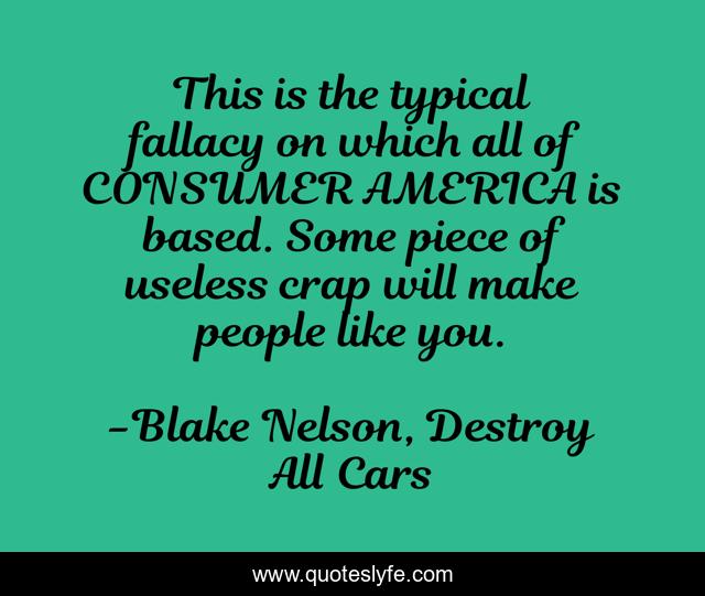 This page presents the quote "This is the typical fallacy on which all of CONSUMER AMERICA is based. Some piece of useless crap will make people like you.". Author of this quote is Blake Nelson, Destroy All Cars. This quote is about society, consumerism,.