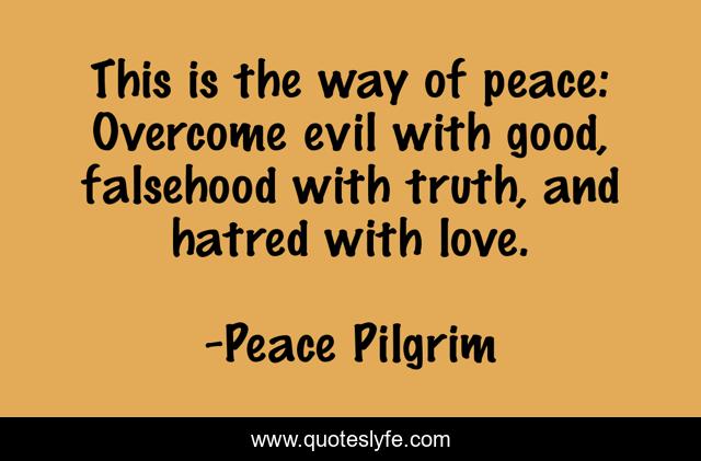 This page presents the quote "This is the way of peace: Overcome evil with good, falsehood with truth, and hatred with love.". Author of this quote is Peace Pilgrim. This quote is about good, love, truth, affection,.