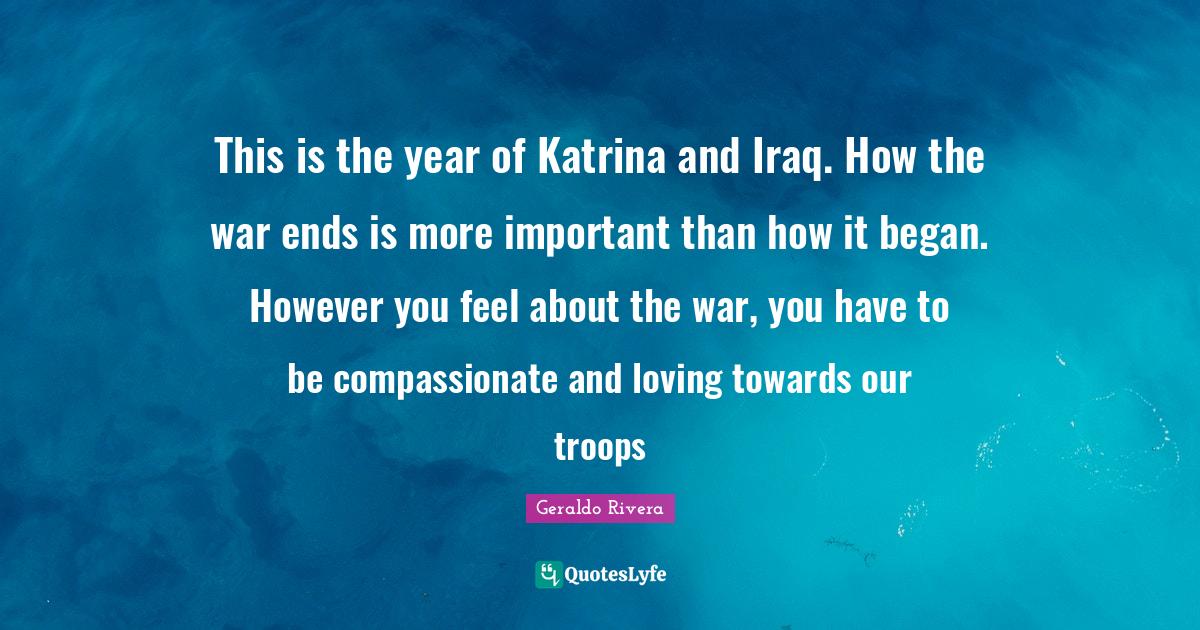 This page presents the quote "This is the year of Katrina and Iraq. How the war ends is more important than how it began. However you feel about the war, you have to be compassionate and loving towards our troops". Author of this quote is Geraldo Rivera. This quote is about ends, our troops, important, compassionate, katrina, iraq, war, years,.