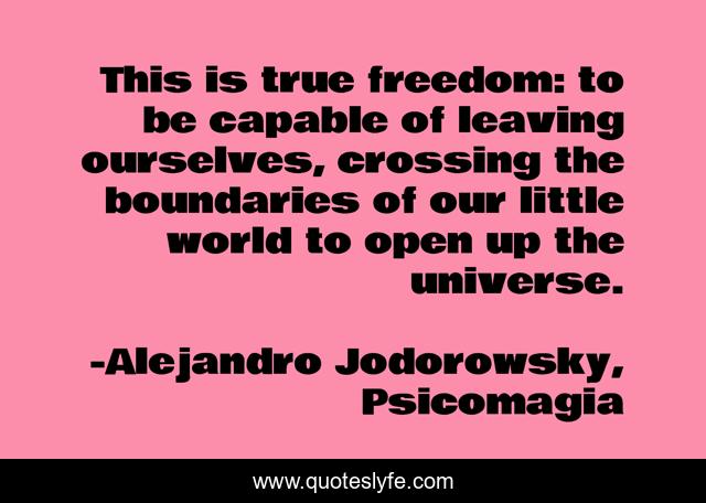 This page presents the quote "This is true freedom: to be capable of leaving ourselves, crossing the boundaries of our little world to open up the universe.". Author of this quote is Alejandro Jodorowsky, Psicomagia. This quote is about boundaries, freedom, universe,.