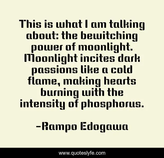 This page presents the quote "This is what I am talking about: the bewitching power of moonlight. Moonlight incites dark passions like a cold flame, making hearts burning with the intensity of phosphorus.". Author of this quote is Rampo Edogawa. This quote is about moonlight, madness, dark-passions, moon,.