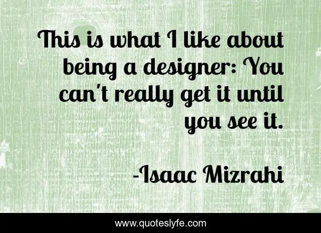 This page presents the quote "This is what I like about being a designer: You can't really get it until you see it.". Author of this quote is Isaac Mizrahi. This quote is about see, like,.